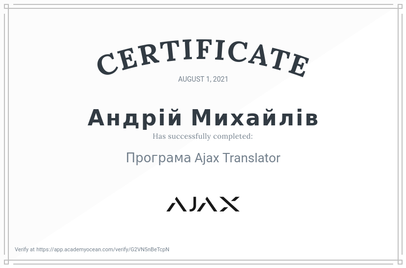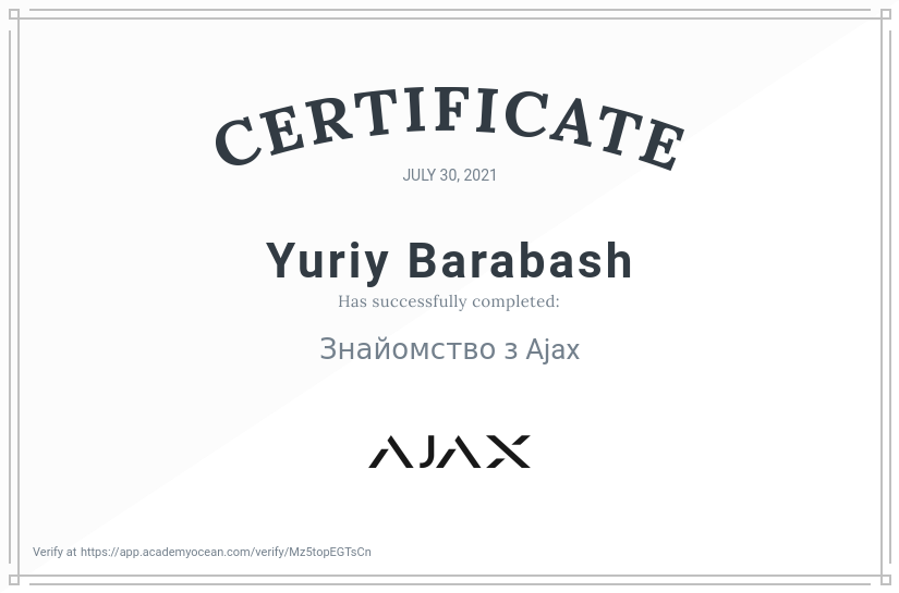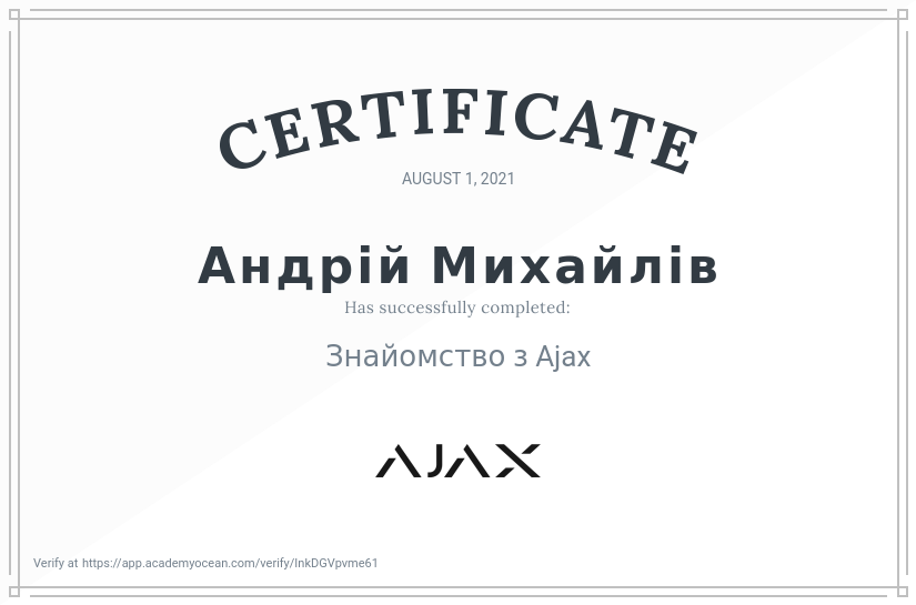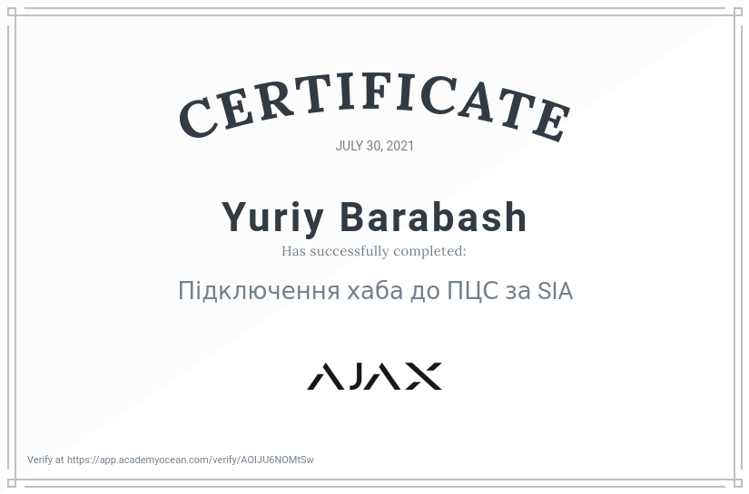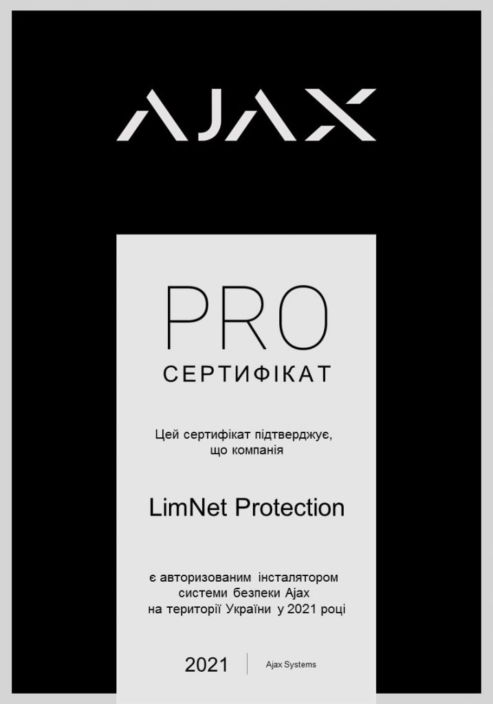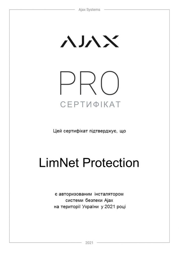 Сертифікати Сертифікати Шановні абоненти, представляємо до вашої уваги офіційні сертифікати якості та професіоналізму, які були надані компанією “AJAX” нашим працівникам. Ваша безпека - у наших руках LimNet Protection Офіційний партнер компанії “AJAX” Сертифікати